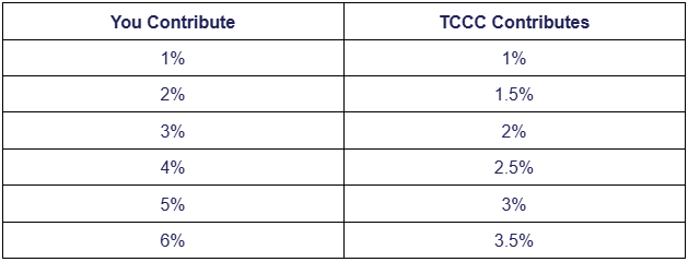TCCC matches 100% of your contributions up to 1% of your salary. After that, their match is a smaller percentage dependent on your total contribution.