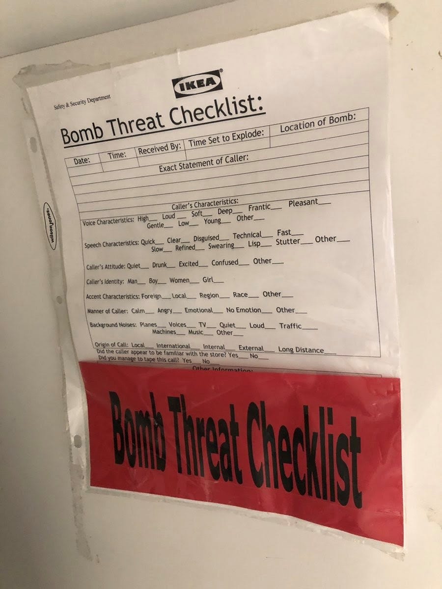 In other words, someone at Ikea thought it was a good idea to think through and document the steps to follow if a store receive a bomb threat.