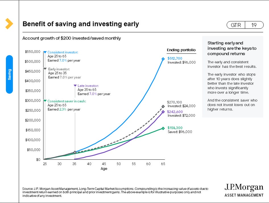 You might want to share the slide above with your children, grandchildren, or other younger friends and family who can benefit from getting started right now and benefitting from the power of compound interest over long periods of time.
